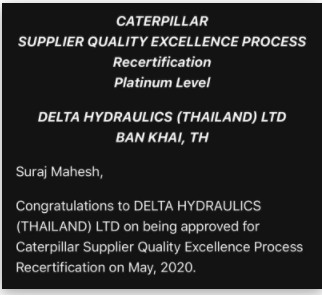 Delta Hose Team achieves a Supplier Quality Excellence Process (SQEP) Platinum Award by CAT for the year 2020.